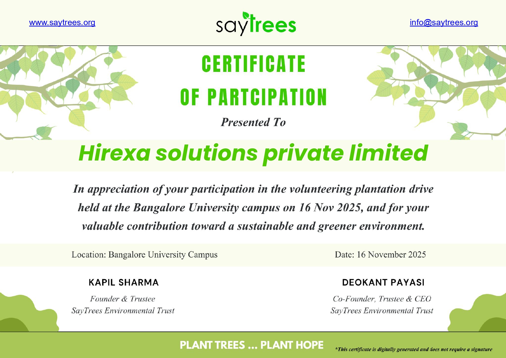 Hirexa Solutions is proud to have received a Certificate of Participation from SayTrees Environmental Trust for contributing to the Tree Plantation Drive at Bengaluru University. This recognition reflects our commitment to sustainability and our efforts toward creating a greener future.